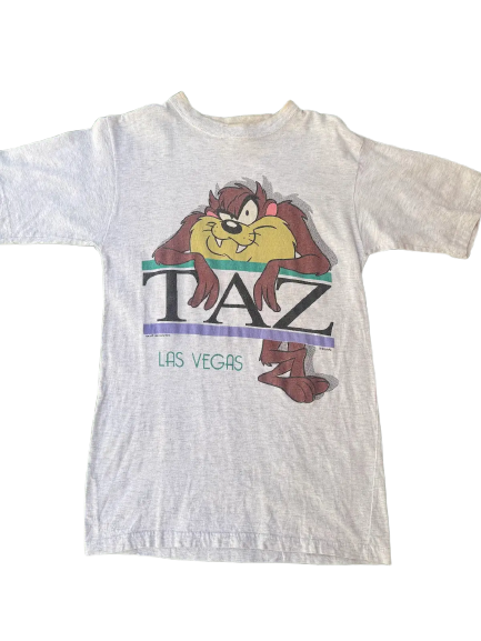 It’s Taz gone wild in Sin City with this 1995 Looney Tunes Las Vegas tee, featuring everyone’s favorite whirlwind of chaos front and center. Printed on a soft heather grey tee with the original Sherry’s Best tag, this gem is a nostalgic blast of ‘90s cartoon energy and Vegas neon vibes.