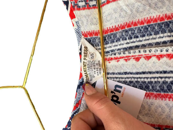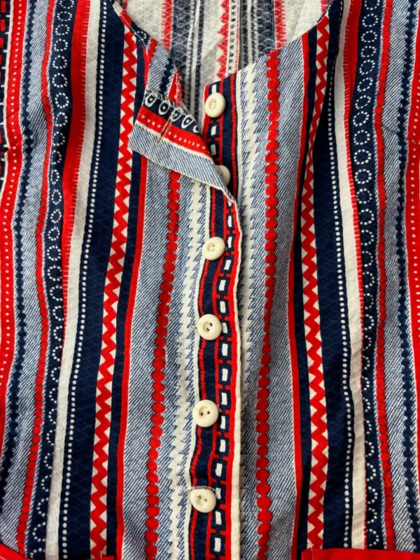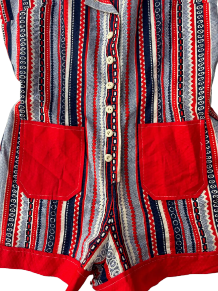 Step into true mod-era style with this 1960s striped permanent press jumpsuit, a standout piece from the golden age of tailored, easy-care fashion. Featuring a bold vertical stripe pattern, structured silhouette, and that signature crisp permanent press fabric, this jumpsuit captures the clean lines and confidence of the decade.