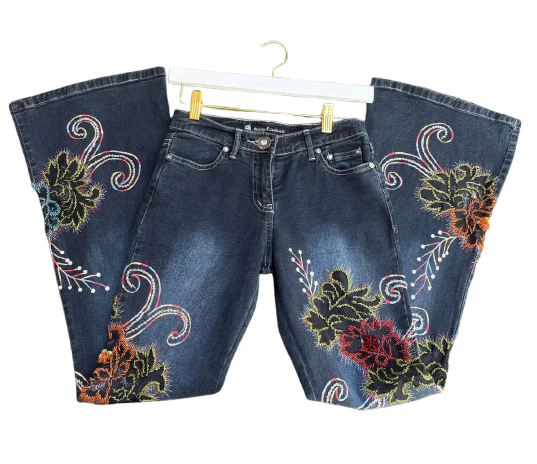 Step into retro glam with these 1980s bell bottom jeans, decked out with vibrant floral embroidery for a perfect mix of bold and boho. Featuring a flattering mid-rise waist and slight flared leg, they bring serious vintage attitude with an 80s twist on 70s style.